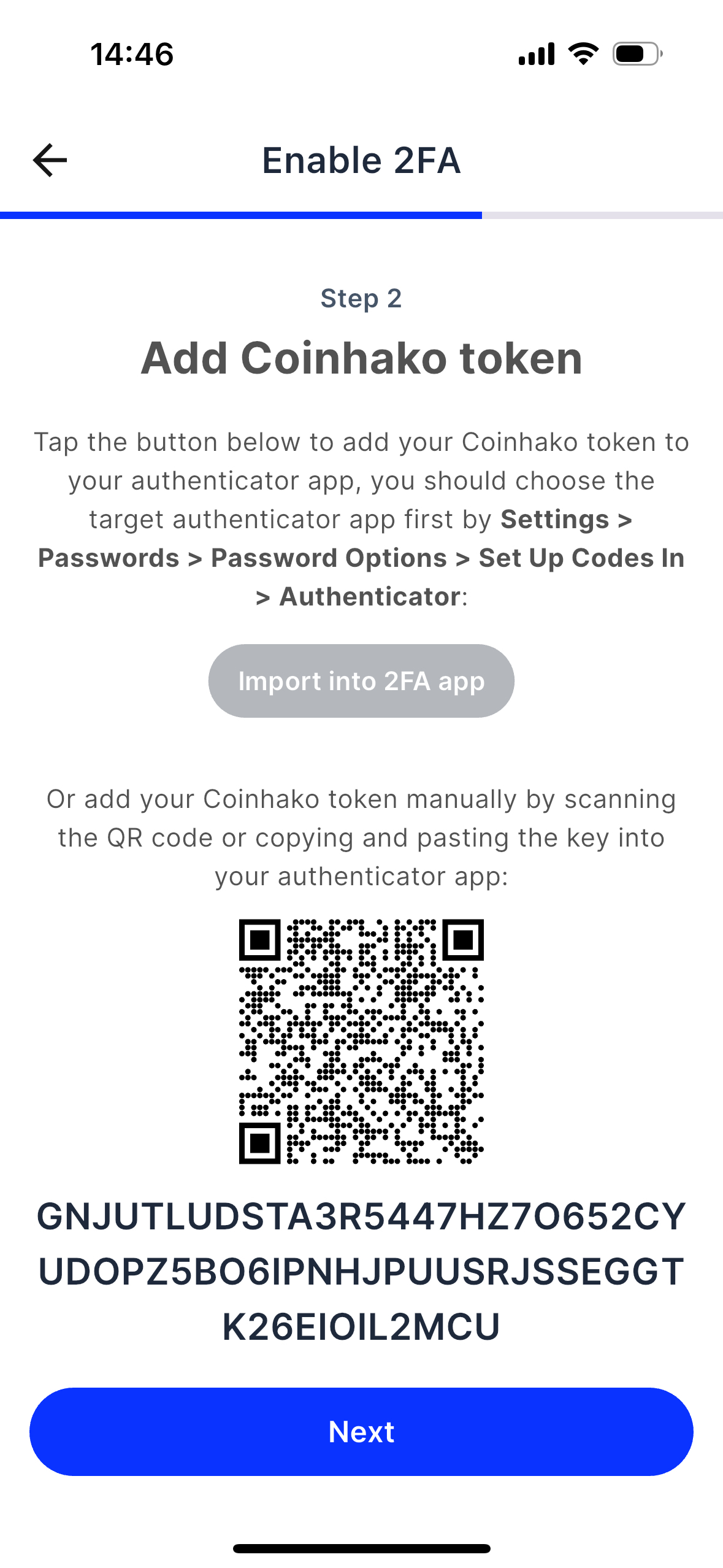 Add your Coinhako token to the authenticator app using one fo the below method, then tap Next.