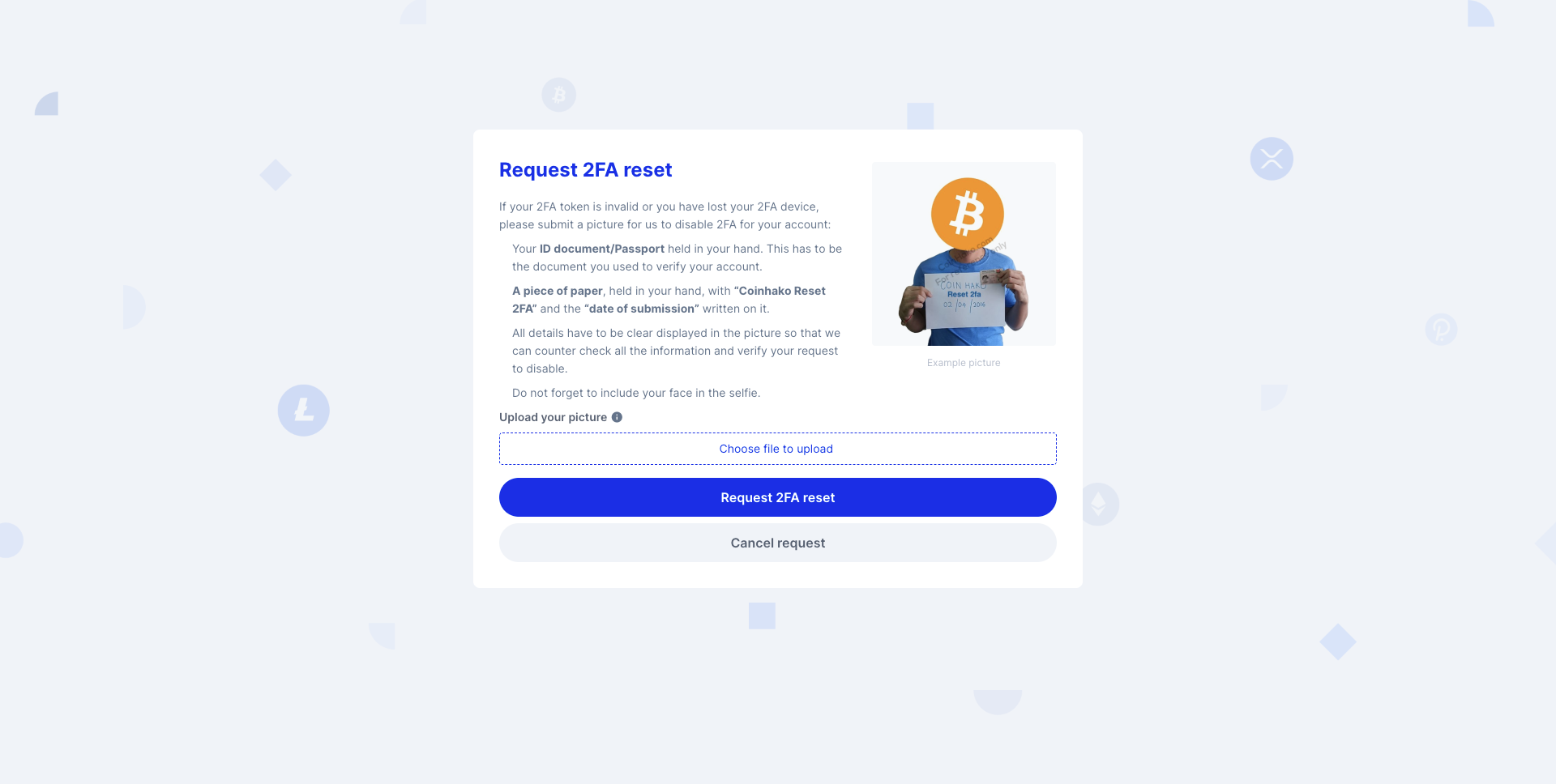 - Upload the selfie under Choose File and select Request 2FA Reset.