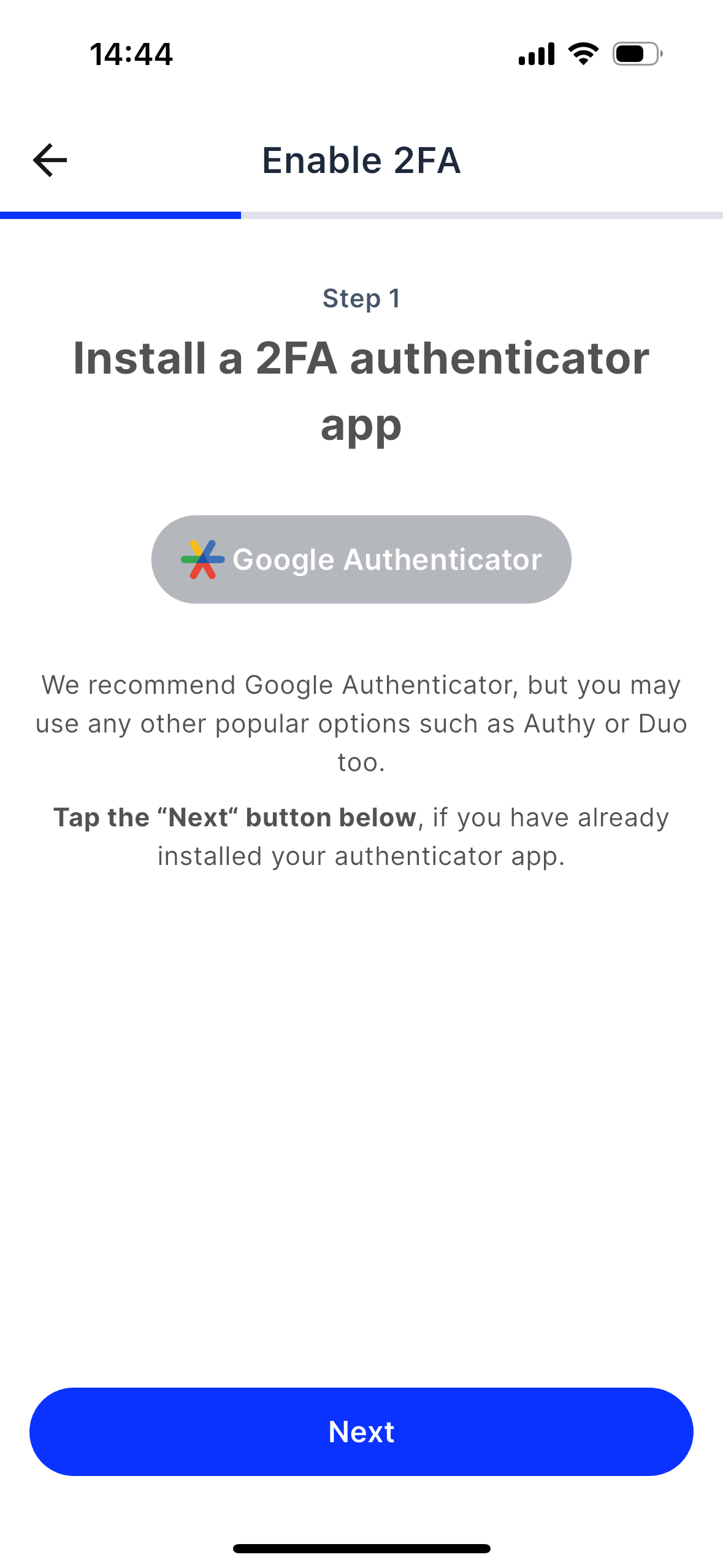 Install an authenticator app on your phone (e.g, Google Authenticator, Authy.), tap Next once your app is installed.