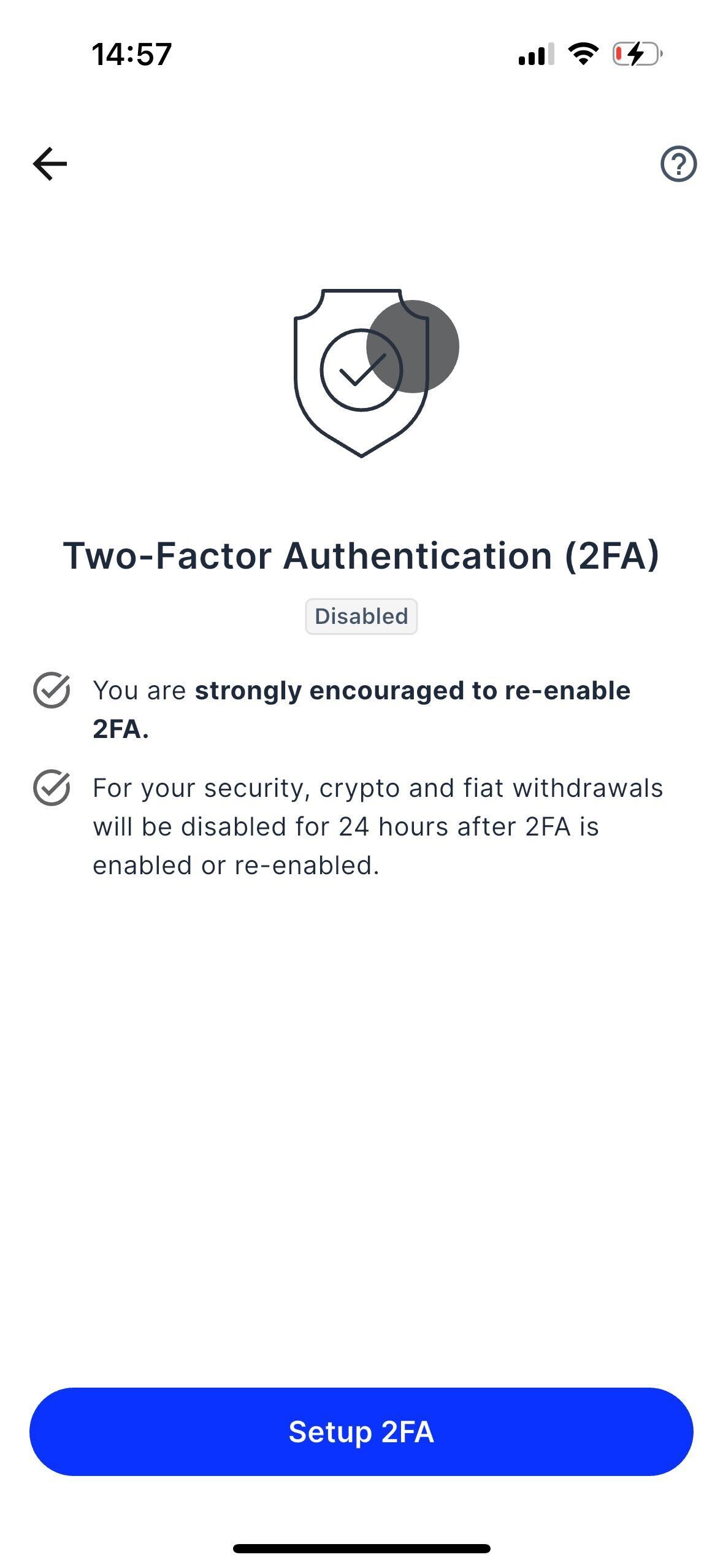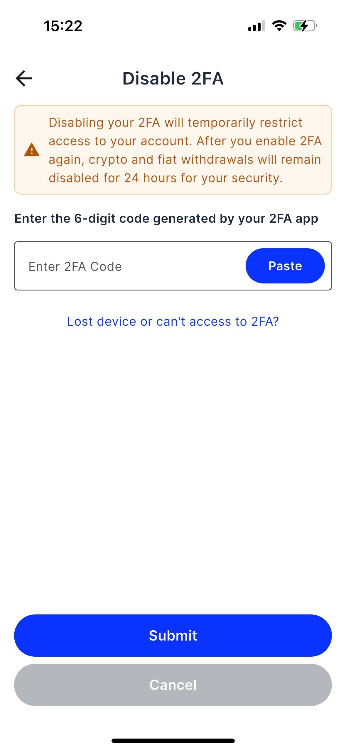 ⚠️ Head-up: Disabling your 2FA will temporarily restrict access to your account. After you enable 2FA again, crypto and fiat withdrawals will remain disabled for 24 hours for your security.