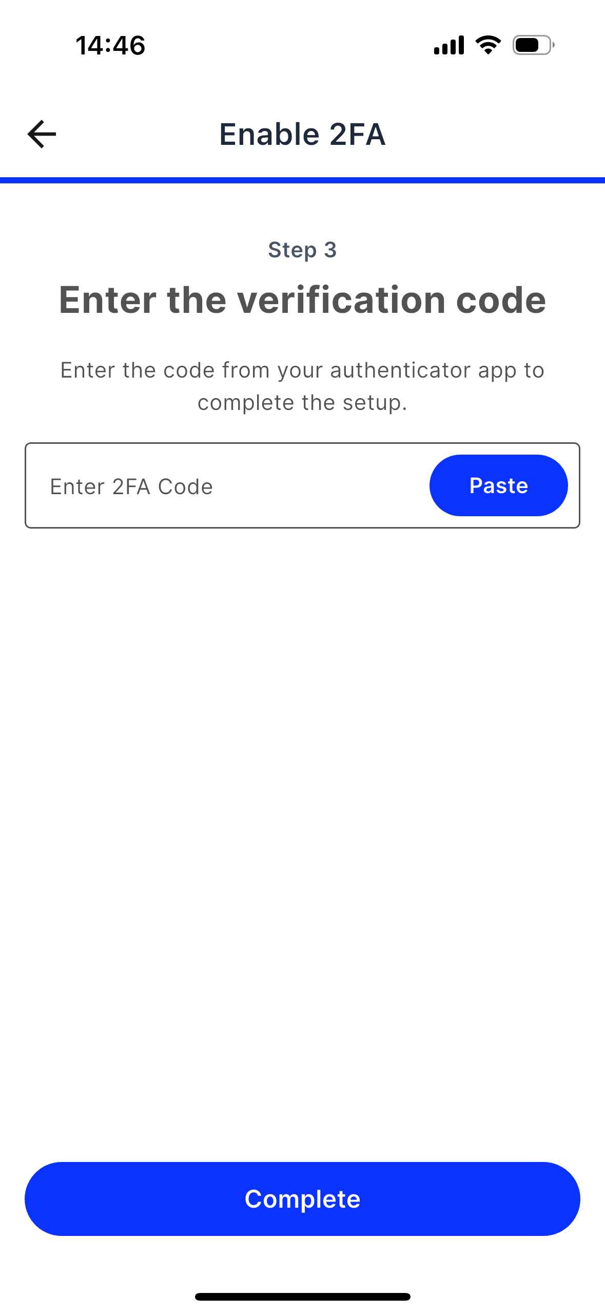 Enter the six-digit verification code from your authenticator app, then tap Complete.